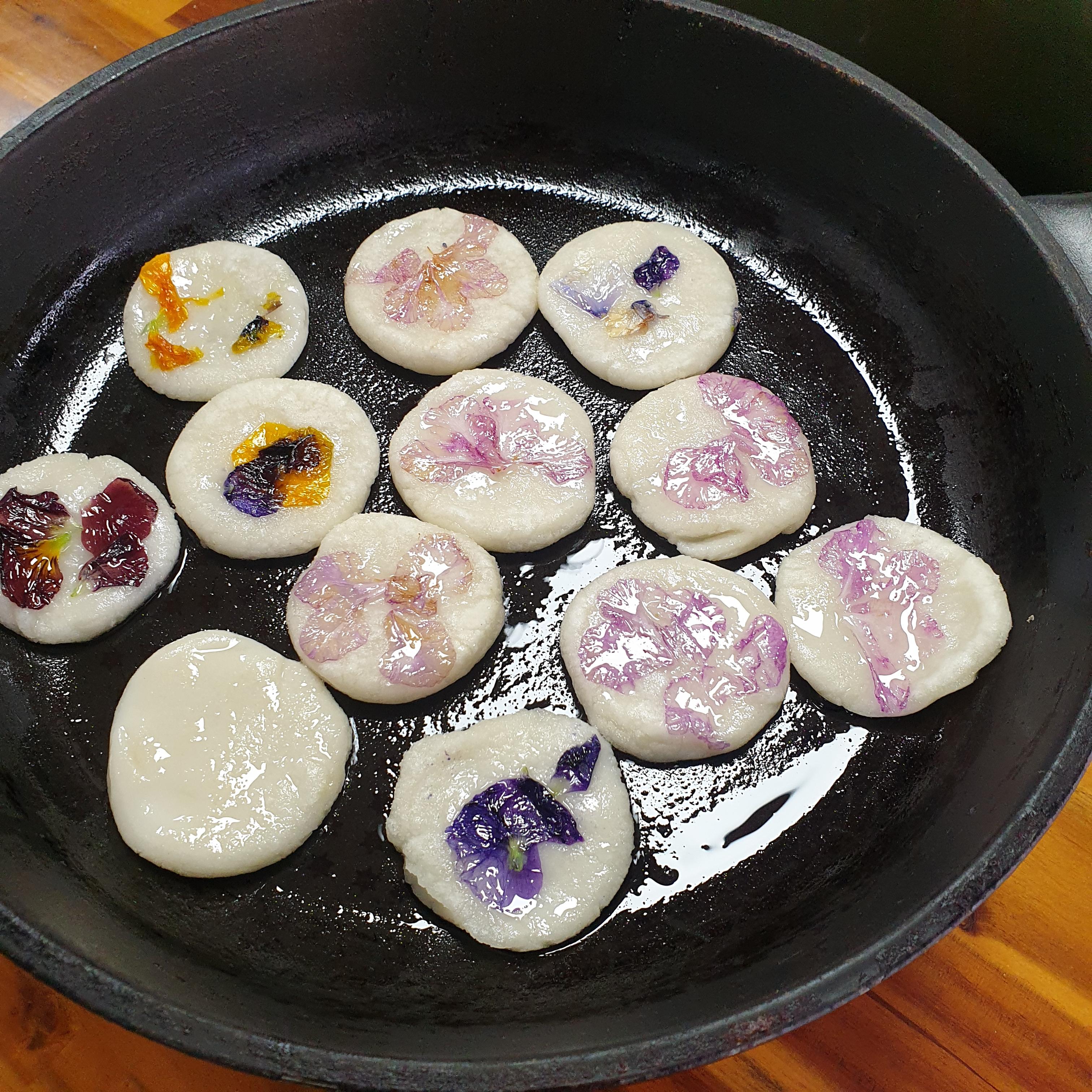 4. 동글 납작 빚은 반죽을 굽다가 꽃을 올려주세요.